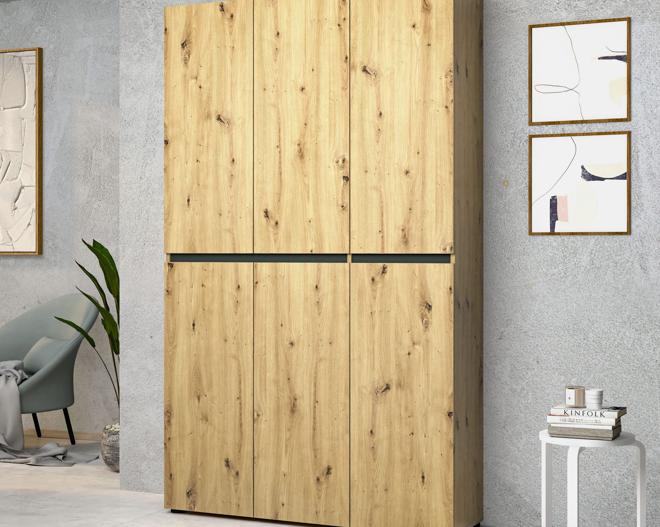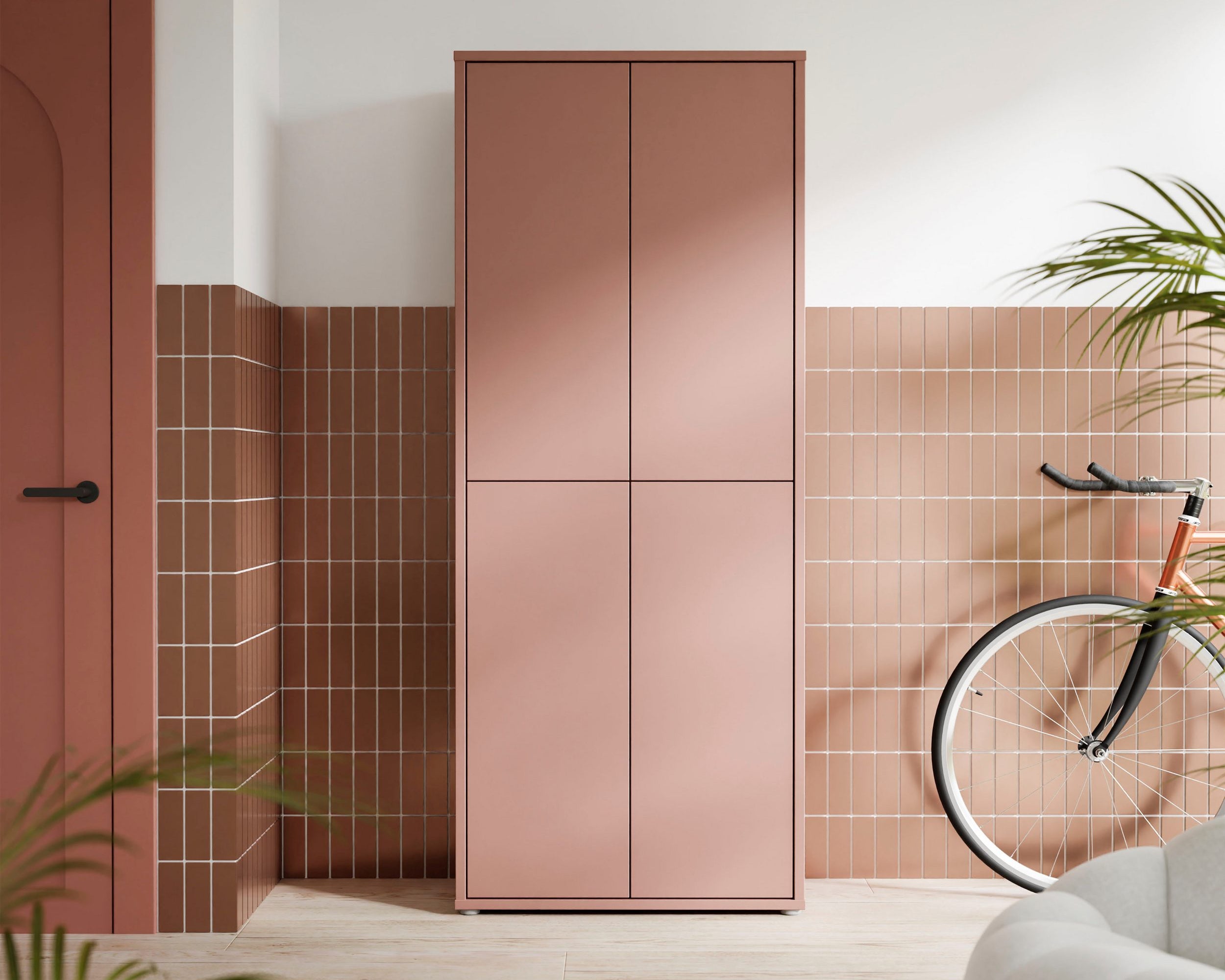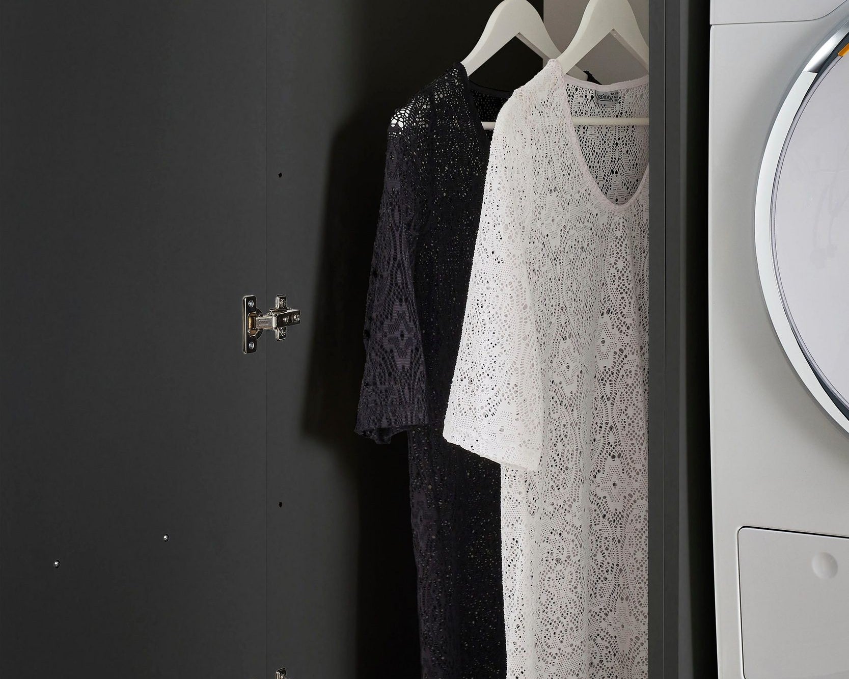 - Ușile moderne fără mâner se deschid automat cu o ușoară apăsare, oferind un acces facil la încălțăminte.