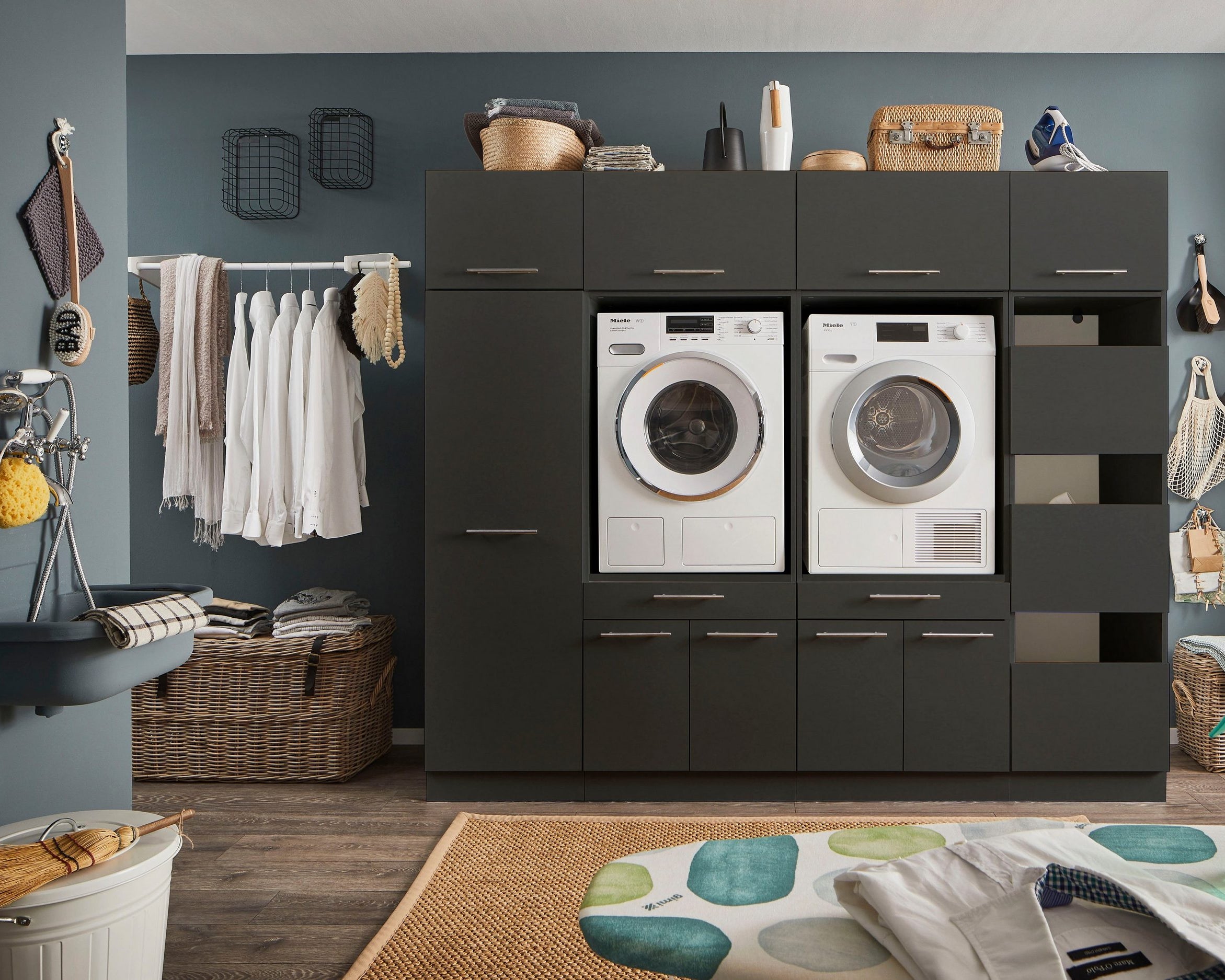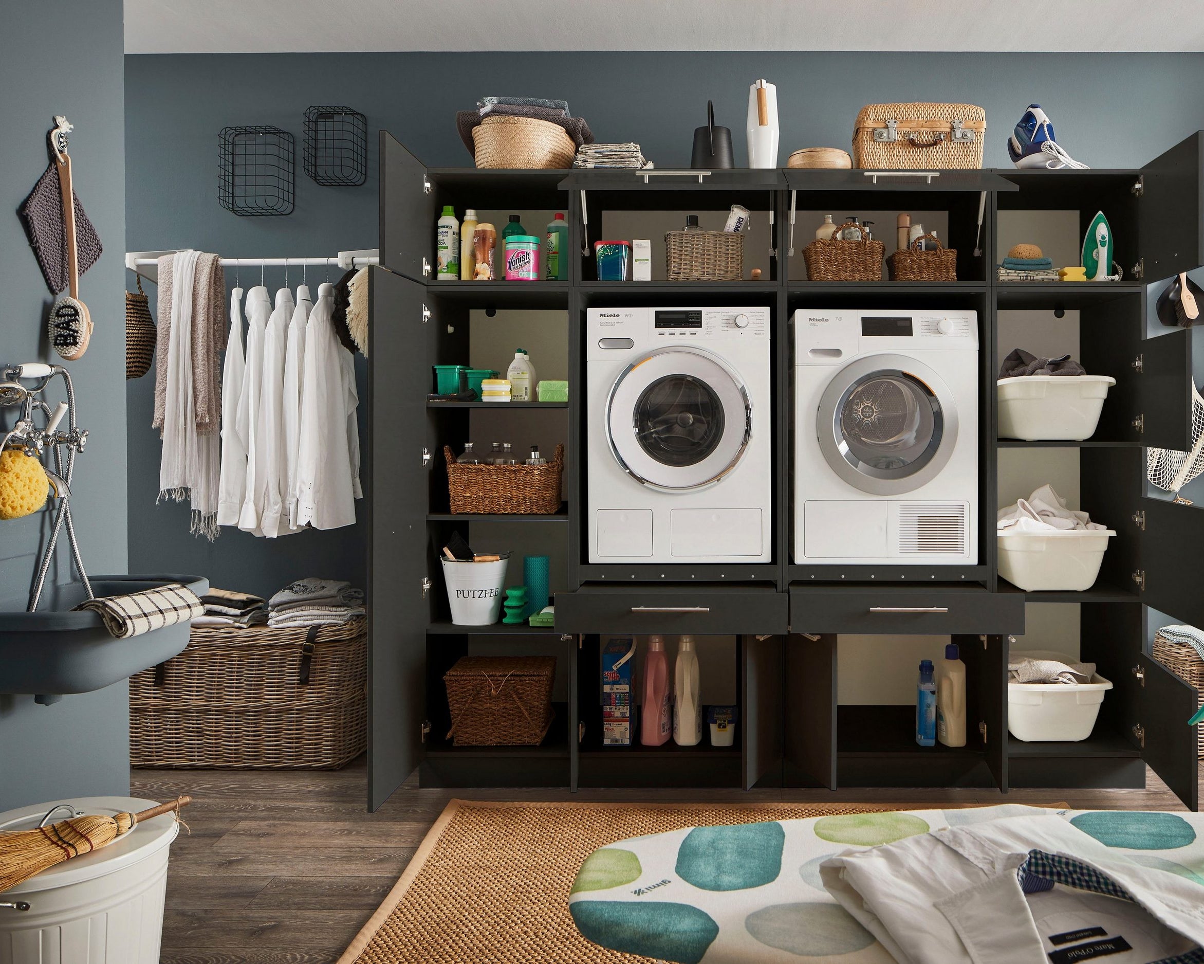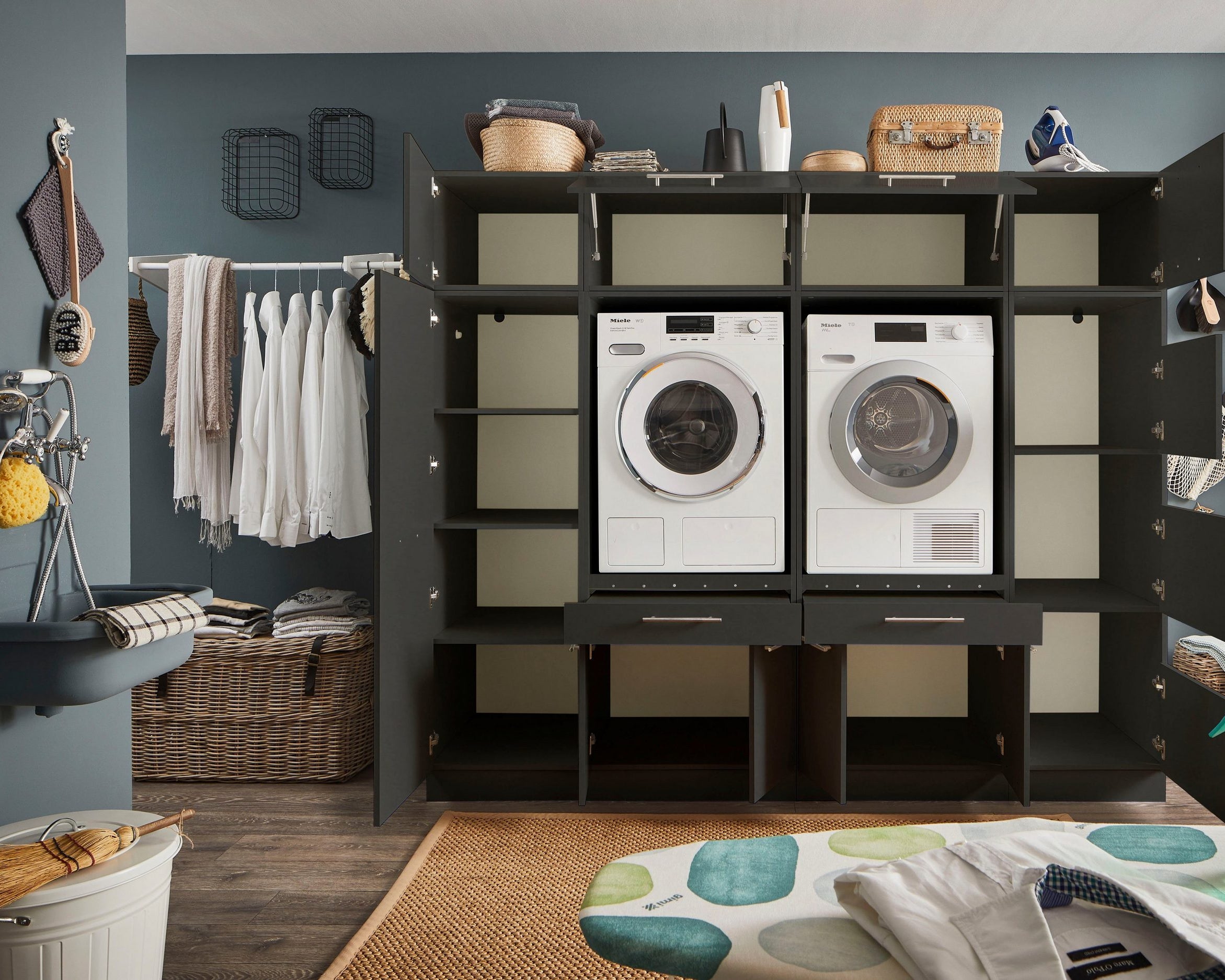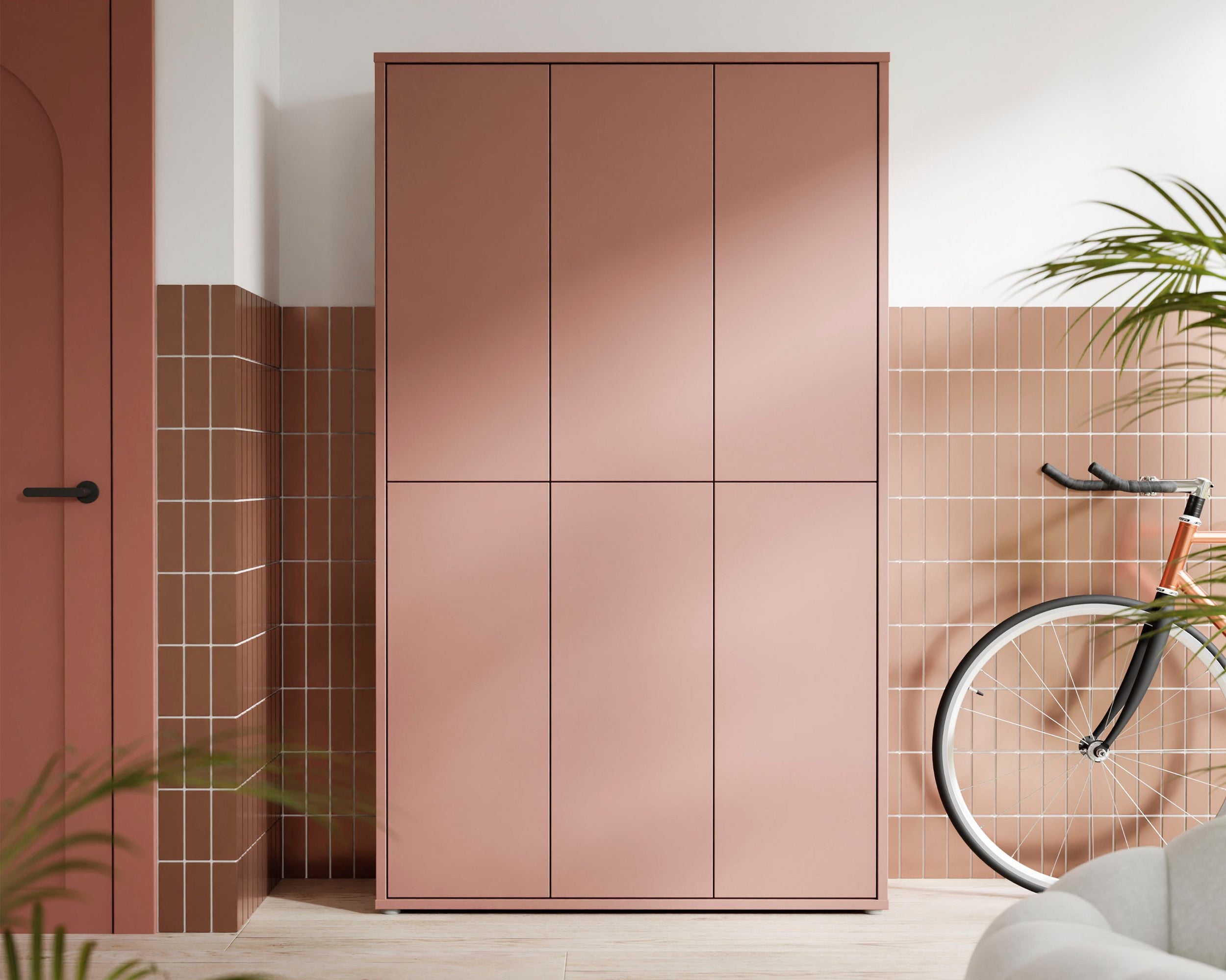 - Ușile moderne fără mâner se deschid automat cu o ușoară apăsare, oferind un acces facil la încălțăminte.