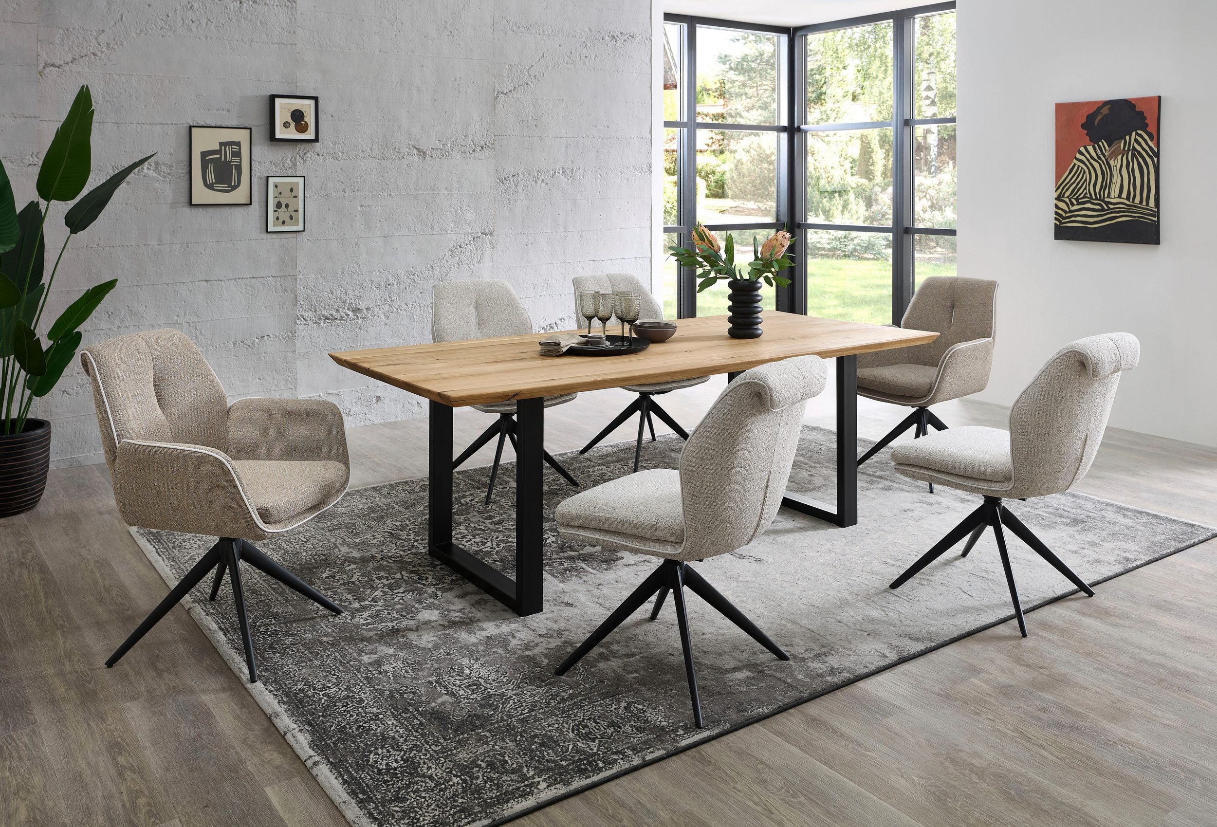Stil modern-minimalist: combină masa cu scaune tapitate în tonuri neutre și accesorii metalice pentru un look elegant.