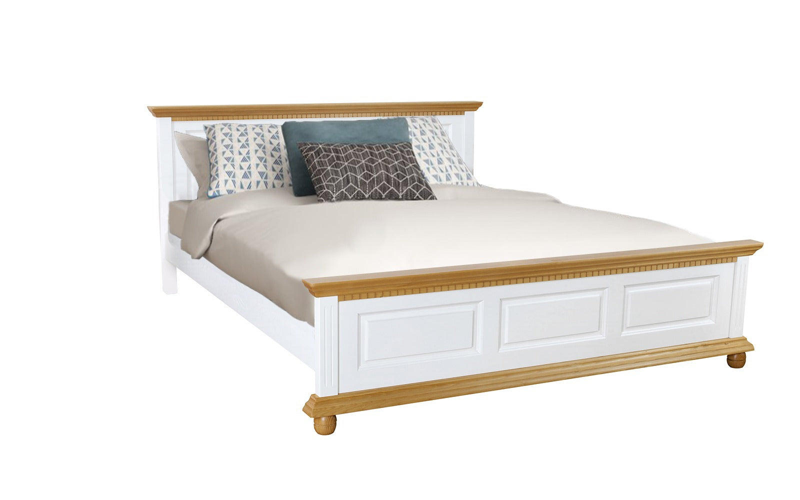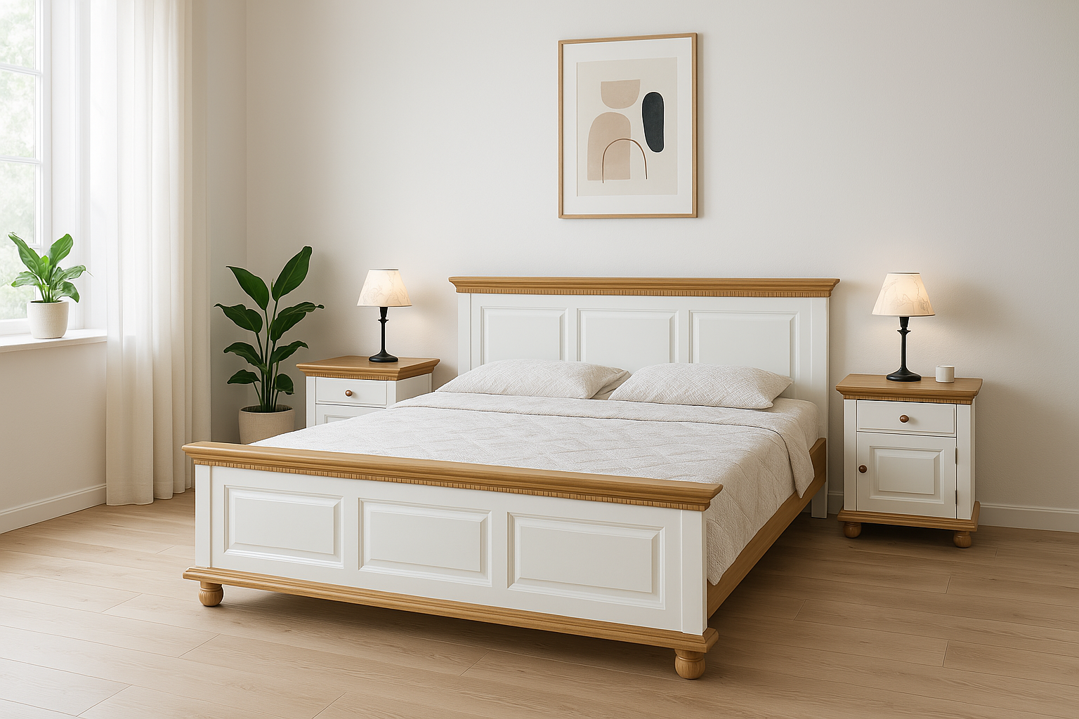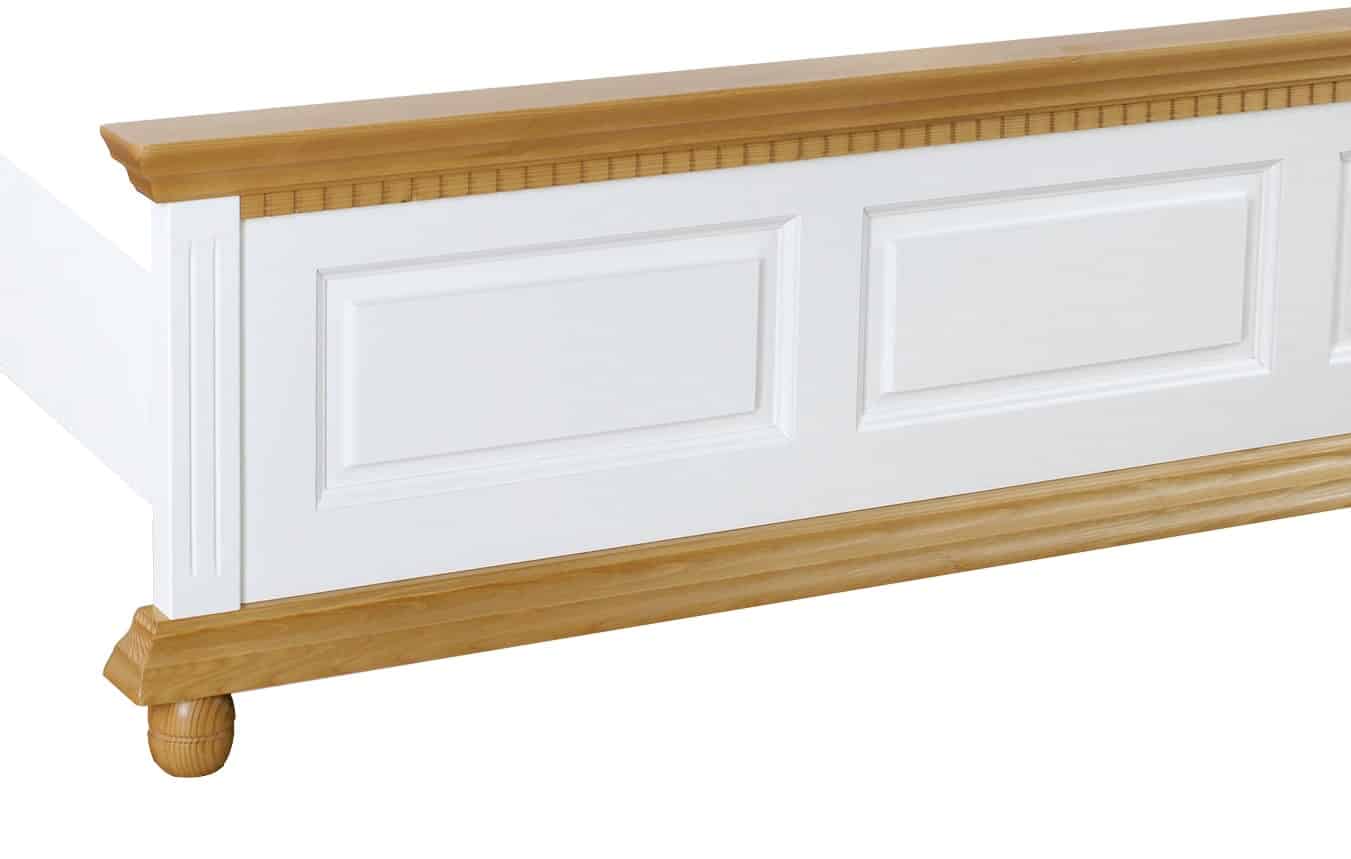 Patul Bavaria este realizat din lemn masiv, fiind conceput pentru cei care caută un echilibru între durabilitate, confort și estetică naturală. Designul său robust, completat de combinația elegantă de alb cald și finisaj natur, îl face potrivit atât pentru dormitoare clasice, cât și pentru amenajări moderne cu accente naturale.