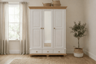 Dulapul Bavaria cu 3 uși și sertare este realizat din lemn masiv, fiind conceput pentru depozitare eficientă și organizare practică în dormitor sau dressing. Designul său echilibrat, completat de finisajul alb cald cu accente natur, oferă un aspect luminos și primitor, ușor de integrat în amenajări clasice, rustice sau moderne cu influențe naturale.