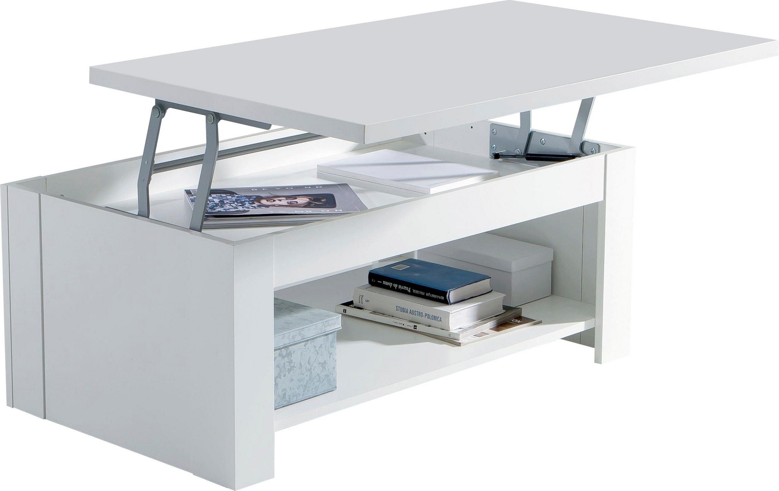 Măsuță de cafea reglabilă pe inaltime FORTE, alb lucios, cu raft, 110×65 cm